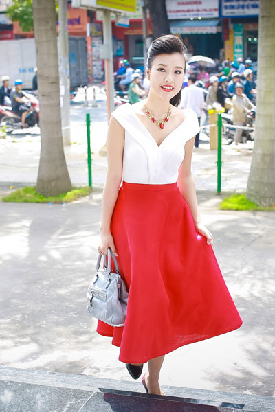 Từ sau khi đoạt danh hiệu Én đồng Người dẫn chương trình 2013, Hoàng Oanh ngày càng đắt show làm MC. Cuối tuần qua, Á hậu Phụ nữ Việt Nam qua ảnh 2012 được mời dẫn dắt sự kiện trao giải tại TPHCM của một kênh truyền hình cáp. Người đẹp thu hút sự chú ý khi diện váy đỏ nổi bật với phần cổ khoét sâu, khoe khéo vai trần gợi cảm. Hoàng Oanh cũng khéo léo phối hợp vòng cổ và màu son đỏ để tạo nên tổng thể ăn ý.